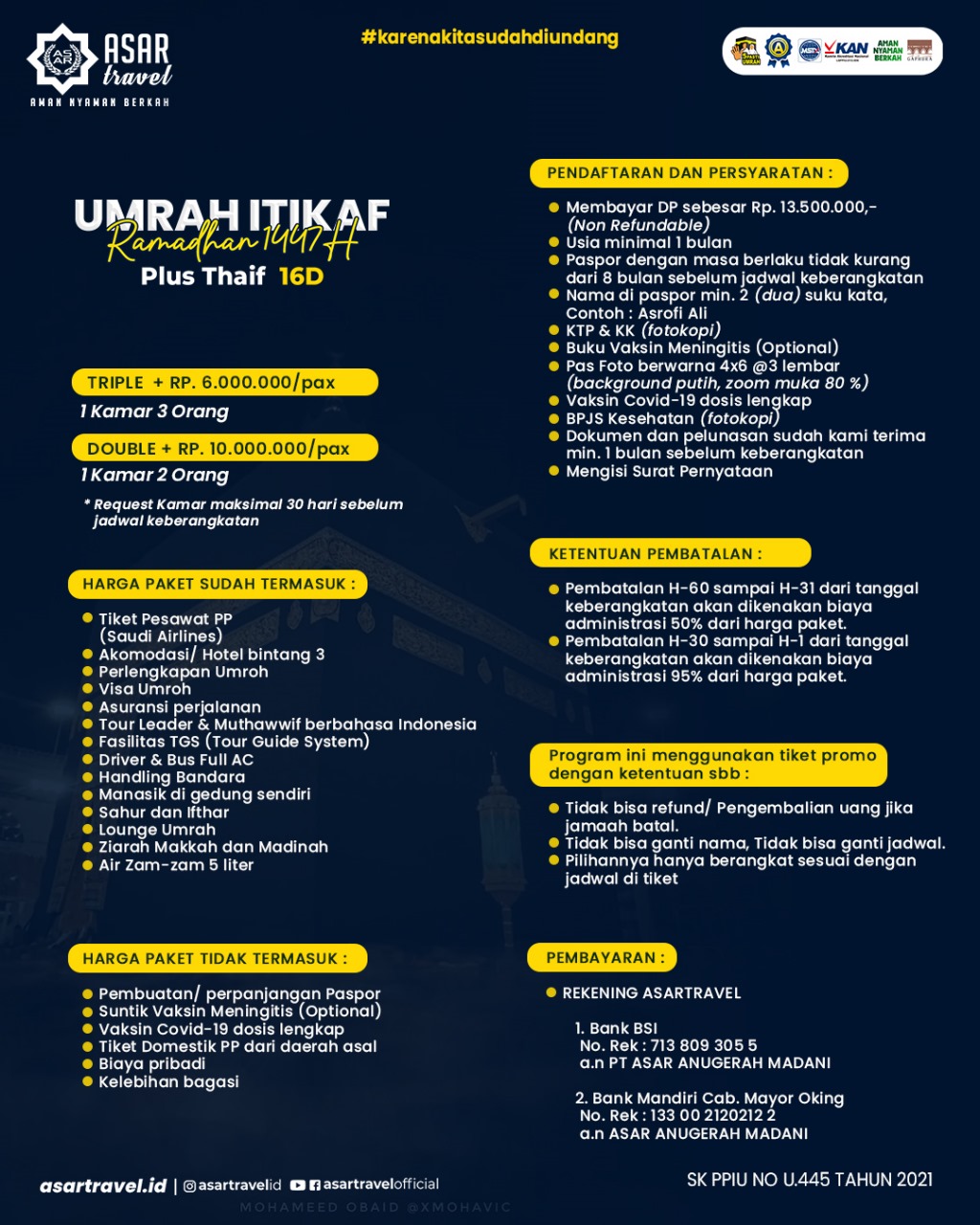 Nikmati pengalaman spiritual luar biasa dengan harga sangat terjangkau dengan Paket Umroh I’tikaf Ramadan Plus Thaif selama 16 hari cuma IDR 39,9 Juta! Selain melaksanakan ibadah umroh, Anda juga akan diajak mengunjungi tempat-tempat bersejarah di Makkah dan Madinah, dipandu oleh ustadz berpengalaman dan tim profesional AsarTour.